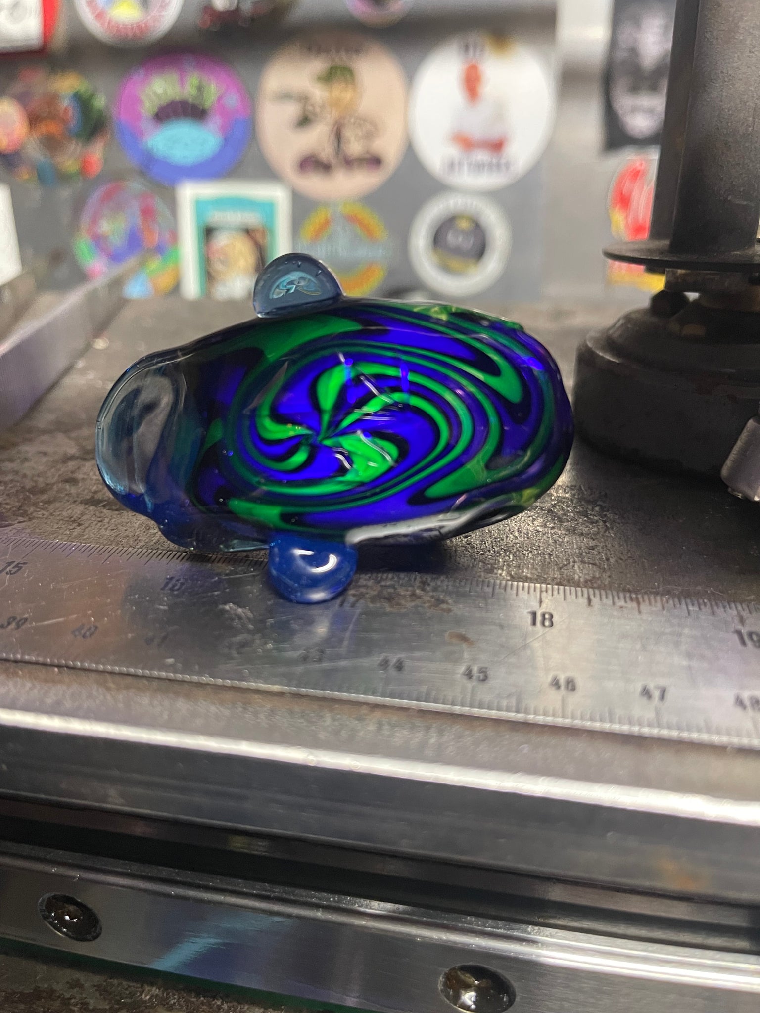 Man you just gotta see this thing to really appreciate it. He has one of my honestly quite rare reversals on the base, which is in really stunning uv reflections and then the face is built entirely in atomic stardust. Which if you check my work over the years you might’ve see me use as it’s been just a favorite for a while. It’s a transparent sparkly blue with a gnarly blue uv reaction. It’s got all the cool parts of uv glass but with the added benefit of not just being kinda a clear off shade. Finished with gold teeth and eyes, he’s a standard size so not too big, not too tiny. Comes ready to wear on an adjustable cord.